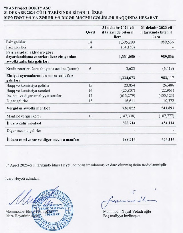 "NAS Project BOKT" ASC 2024-cü ili 589 min manat xalis mənfəət ilə başa vurub. Kredit təşkilatı 2023-cü ili 434 min manat xlias mənfəət ilə bağlamışdı. Beləliklə, "NAS Project BOKT"ın xalis mənfəəti 2024-cü ildə 2023-cü illə müqayisədə 155 min manat və ya 35,7% artıb.