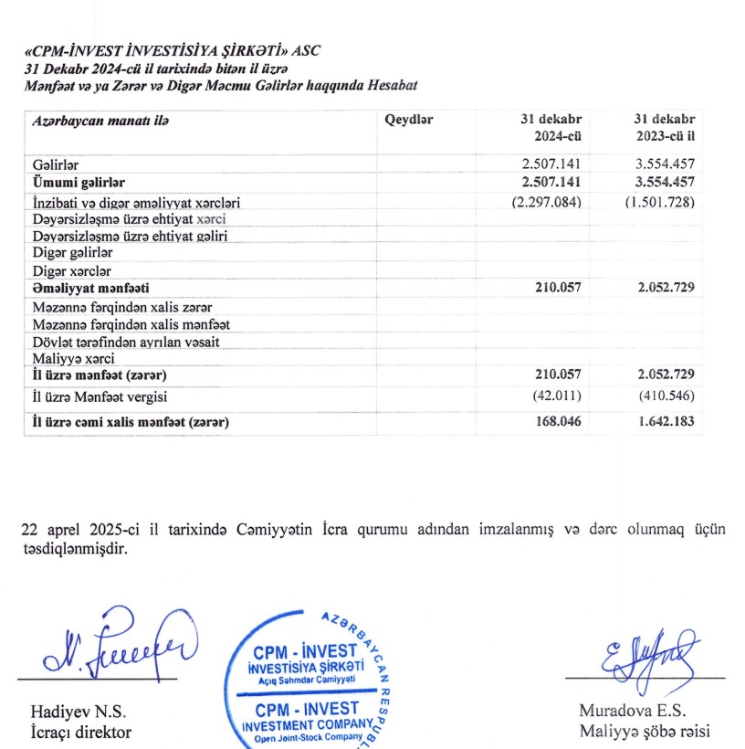 Marja.az Şirkətin illik maliyyə hesabatlarına istinadən xəbər verir ki, “CPM İnvest İnvestisiya Şirkəti”nin cəmi gəlirləri 2023-cü ildə 3 milyon 554 min manat ikən, 2024-cü ildə 2 milyon 507 min manata düşüb. Eyni dövrdə Şirkətin inzibati və digər əməliyyat xərcləri 795 min manat və ya 53% artaraq 2 milyon 297 min manat təşkil edib. Ötən il “CPM İnvest" 41 min manat mənfəət vergisi də ödəyib.