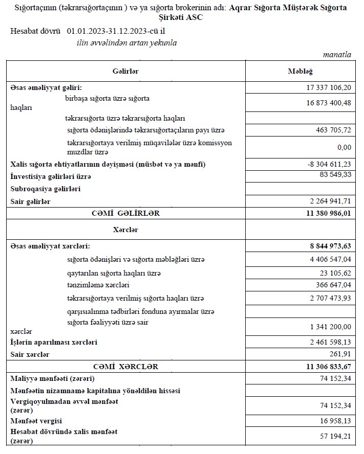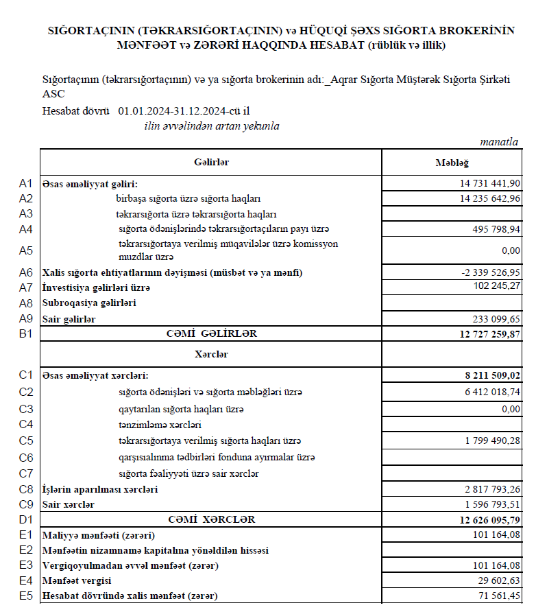 "Aqrar Sığorta Müştərək Sığorta Şirkəti" 2024-cü ildə 14 milyon 236 min manat birbaşa sığorta haqları hesablayıb (2023-cü ildə 16 milyon 873 min manat)