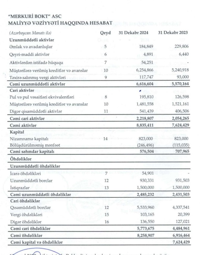 635"Merkuri Bank Olmayan Kredit Təşkilatı" ASC 2024-cü ili 82 min manat xalis mənfəət ilə başa vurub. BOKT 2023-cü ili 225 min manat xalis mənfəət ilə bağlamışdı. Beləliklə, ötən il "Merkuri BOKT"ın xalis mənfəəti 143 min manat və ya 63,5% azalıb.