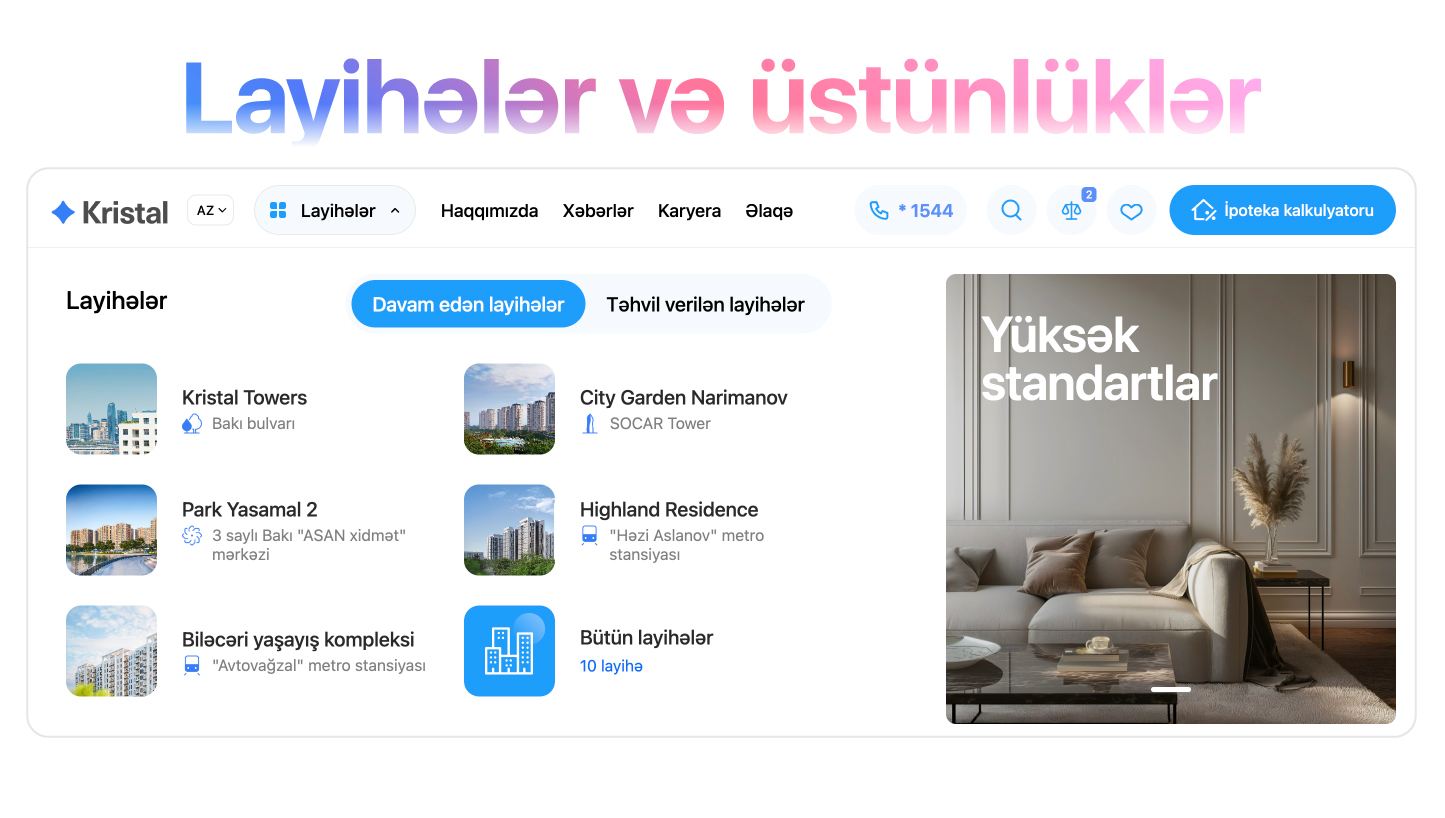 Bütün layihələr bir toxunuşla qarşınızda. Yenilənmiş kristal.az veb-saytı vasitəsilə istifadəçilər artıq “Kristal” şirkətinin təhvil verilmiş və inşası davam edən bütün layihələri, onların yerləşdiyi ərazilər, mənzillərin sahələri, otaq sayı, təklif olunan qiymət aralıqları və digər vacib parametrlər haqqında ətraflı məlumat əldə edə biləcəklər. Yeni platforma bu məlumatları sadə, vizual və rahat formada təqdim edərək istifadəçiyə seçim prosesini daha aydın və sürətli şəkildə aparmağa şərait yaradır.