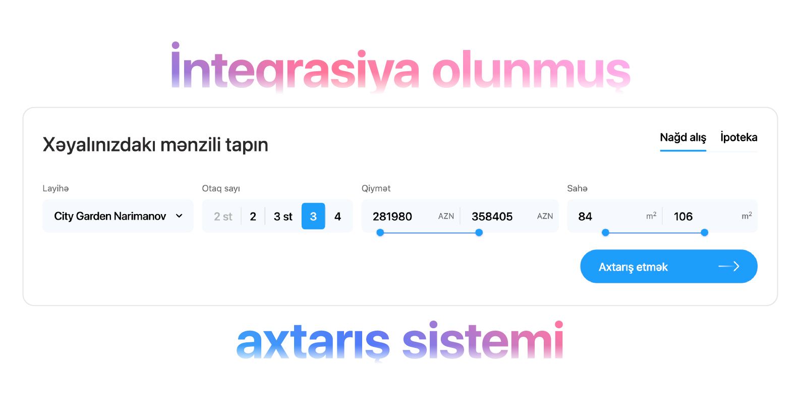 Birbaşa inteqrasiyalı təkmilləşdirilmiş mənzil axtarış sistemi və ipoteka kalkulyatoru. Saytda inteqrasiya edilmiş dəqiq ipoteka kalkulyatoru vasitəsilə istənilən mənzil üzrə ilkin ödənişi, aylıq ödənişləri və ümumi kredit dəyərini bir neçə saniyə ərzində hesablamaq mümkündür. Bununla yanaşı, saytın ən innovativ funksiyalarından biri olan mənzil müqayisə bölməsi alıcılara eyni anda bir neçə mənzilin texniki və maliyyə göstəricilərini paralel şəkildə analiz etməyə, daha doğru qərar verməyə imkan yaradır.