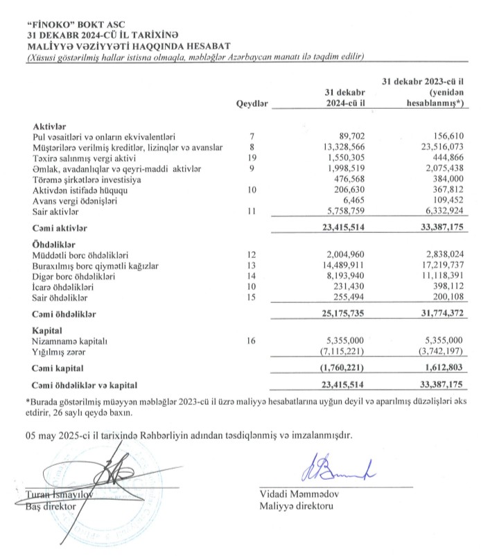 Yığılmış zərər "FİNOKO BOKT"ın nizamnamə kapitalını silib."FİNOKO Bank Olmayan Kredit Təşkilatı" ASC 2024-cü ili 3 milyon 173 min manat xalis zərər ilə başa vurub. Təşkilat 2023-cü ili 1 milyon 622 min manat xalis zərər ilə bağlamışdı. Beləliklə, ötən il "FİNOKO BOKT"ın xalis zərəri 2 dəfə artıb.