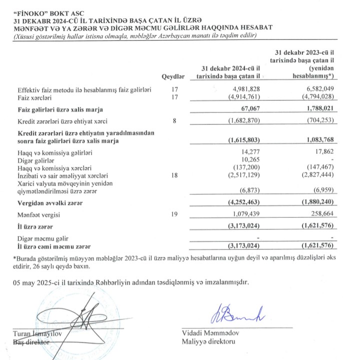 Faiz gəlirlərinin azalması, yüksək faiz xərcləri və kredit zərərləri üzrə ehtiyatlara ayırmanın artması "FİNOKO BOKT"ın zərər etməsinə səbəb olub.
