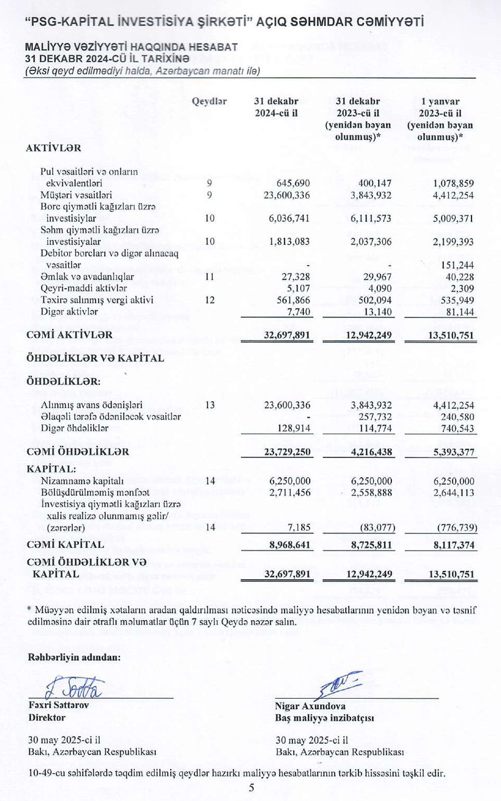 31 dekabr 2024-cü il tarixində “PSG-Kapital” 32 milyon 698 min manat cəmi aktivlərə malik olub. Şirkət 2023-cü ilin sonunda 12 milyon 942 min manat cəmi aktivlərə malik idi. Şirkətin cəmi aktivlərinin 2,5 dəfə artması müştərilərin vəsaitlərinin 6 dəfədən çox artaraq 23 milyon 600 min manata yüksəlməsilə əlaqədardır.