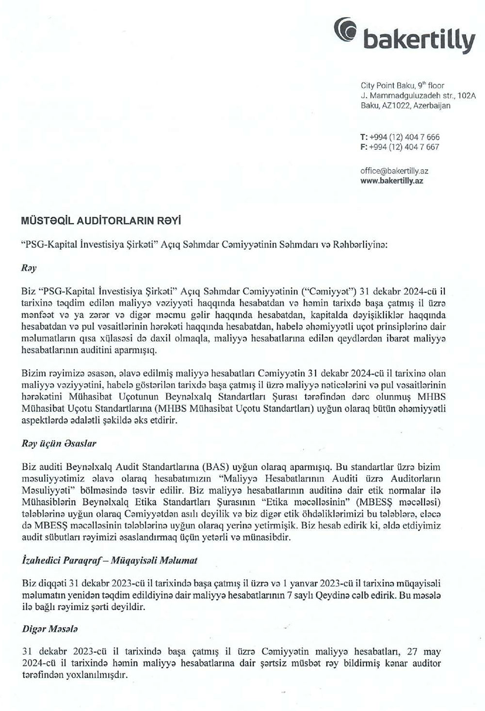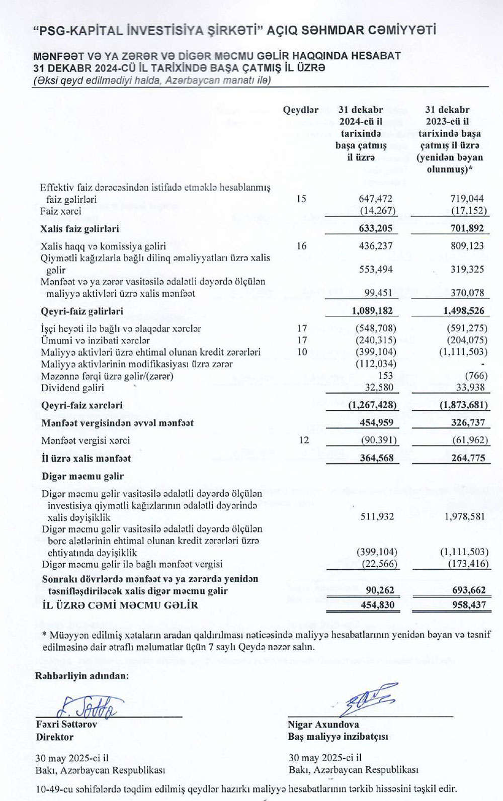 Marja.az “PSG-Kapital İnvestisiya Şirkəti” ASC-nin 31 dekabr 2024-cü il tarixində başa çatmış il üzrə auditor hesabatına istinadən xəbər verir ki, keçən il Şirkətin faiz gəlirləri 72 min manat və ya 9,95% azalaraq 647 min manat, qeyri-faiz gəlirləri isə 409 min manat və ya 27,3% azalaraq 1 milyon 89 min manat təşkil edib. Eyni zamanda, “PSG-Kapital”ın qeyri-faiz xərcləri 606 min manat və ya 32,3% azalaraq 1 milyon 267 milyon manata düşüb. Gəlirlərin 481 min manat azalmasına qarşı, xərclərin daha çox - 609 min manat azalması “PSG-Kapital”ın mənfəətinin artmasını təmin edib. Qeyri-faiz xərclərinin azalmasına maliyyə aktivləri üzrə ehtimal olunan kredit zərərlərinin 2,8 dəfə azalaraq 399 min manata düşməsi səbəb olub.
