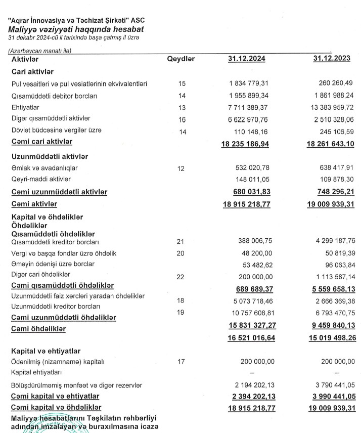Gübrə, toxum və aqrokimyəvi məhsulların topdan satışı ilə məşğul olan "Aqrar İnnovasiya və Təchizat Şirkəti" ASC 2024-cü ili 1 milyon 761 min manat xalis zərər ilə başa vurub. Şirkət 2023-cü ili 1 milyon 820 min manat xalis zərər ilə bağlamışdı. 2023 və 2024-cü illərdə "Aqrar İnnovasiya və Təchizat Şirkəti"nin cəmi zərəri 3 milyon 581 min manatdır.