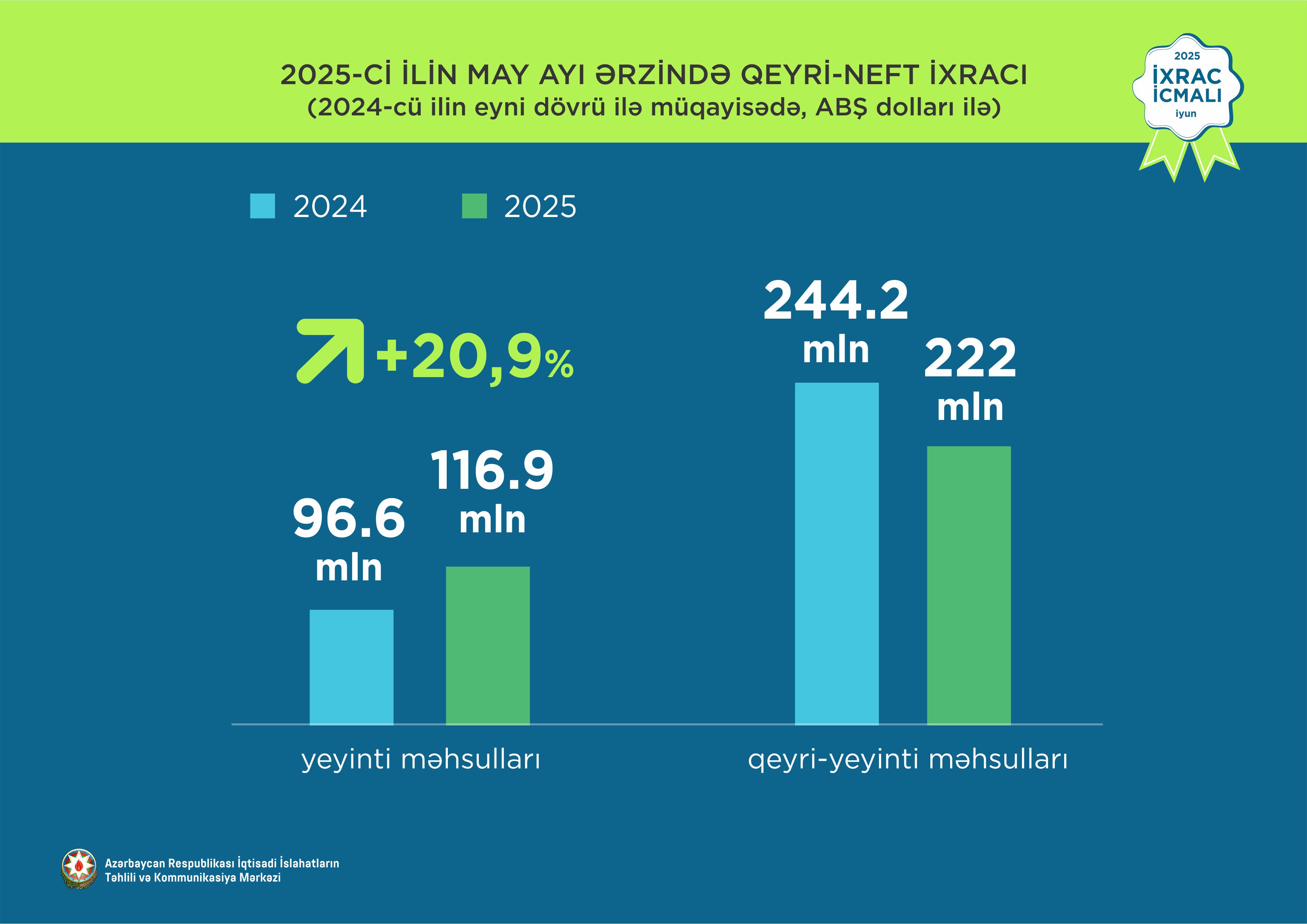 İcmala əsasən, 2025-ci ilin yanvar-may aylarında Azərbaycanın qeyri-neft sektoru üzrə ixracı 2024-cü ilin müvafiq dövrü ilə müqayisədə 11.6% artaraq 1,4 milyard ABŞ dolları təşkil edib. 2025-ci ilin yanvar-may aylarında yeyinti məhsulları üzrə ixrac 14,4% artaraq 417.7 milyon ABŞ dollarına bərabər olub.