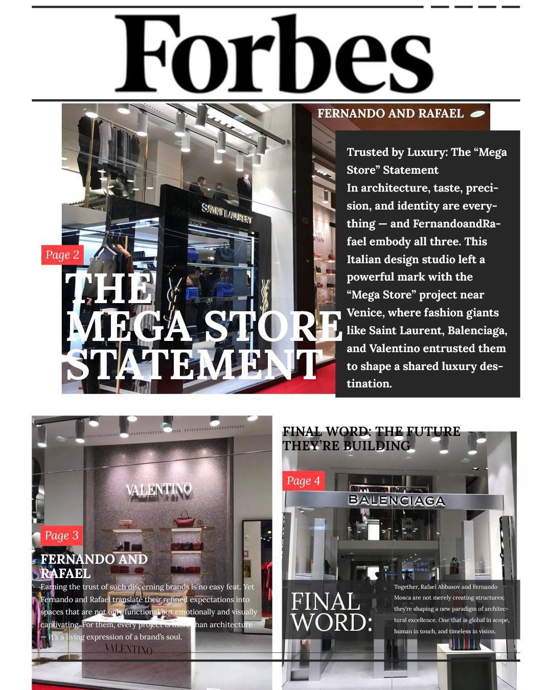 Beynəlxalq nüfuzlu “Forbes” jurnalı qeyd edib ki, “Valentino, “Chloé”, “Yves Saint Laurent (YSL)”, "Balenciaga" kimi dünyanın aparıcı brendləri “Fernando & Rafael” memarlıq studiyasına etibar edir. Bu uğurun və etibarın arxasında duranlardan biri də azərbaycanlı memar, studiyanın təsisçilərindən olan Rafael Abbasovdur.