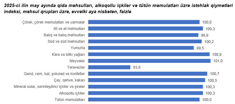 2025-ci ilin may ayında qida məhsulları, alkoqollu içkilər və tütün məmulatları üzrə istehlak qiymətləri indeksi əvvəlki aya nisbətən 0,4 faiz azalıb, yanvar-may aylarında isə əvvəlki ilin müvafiq dövrünə nisbətən 6,5 faiz artıb.