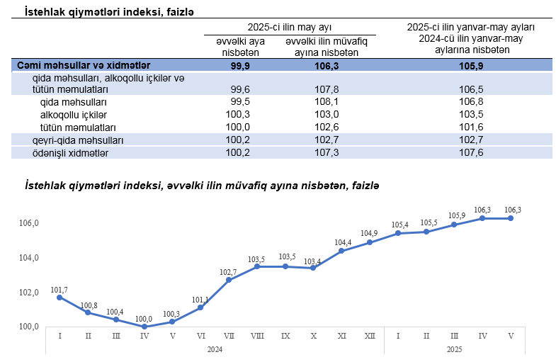 2025-ci ilin may ayında istehlak qiymətləri indeksi əvvəlki aya nisbətən 0,1 faiz azalıb, yanvar-may aylarında isə əvvəlki ilin müvafiq dövrünə nisbətən 5,9 faiz yüksəlib.