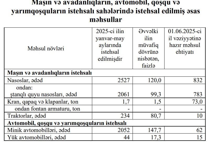 Yanvar-may aylarında əvvəlki ilin müvafiq dövrü ilə müqayisədə yük avtomobillərinin istehsalı 82,7% azalaraq 44 ədəd, traktorların istehsalı 19,8% azalaraq 234 ədəd təşkil edib.