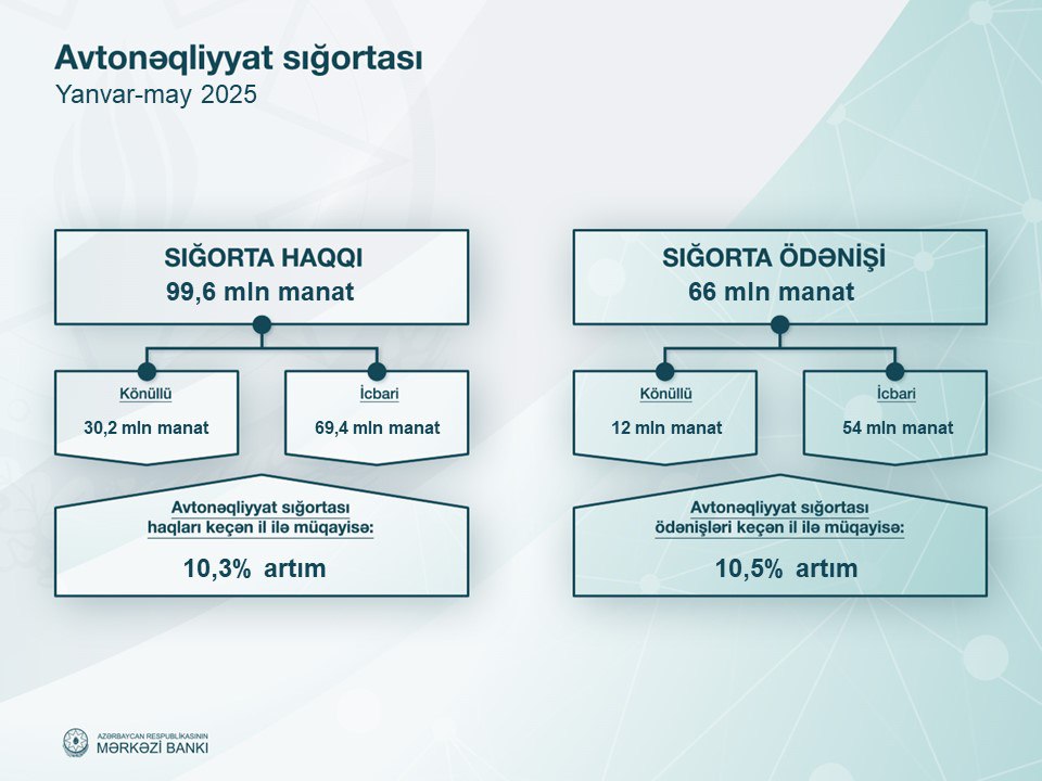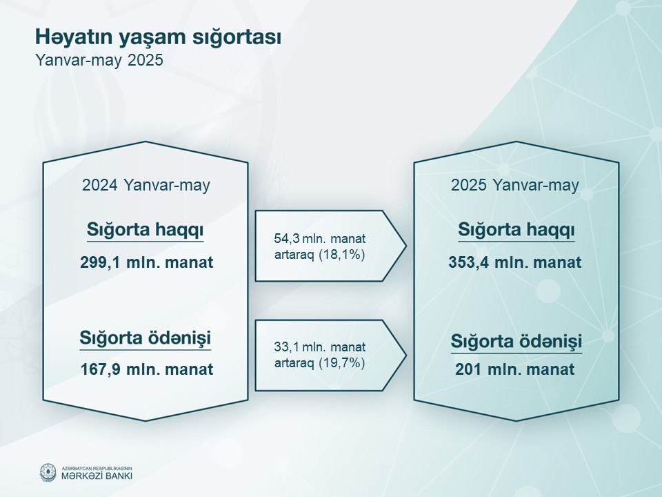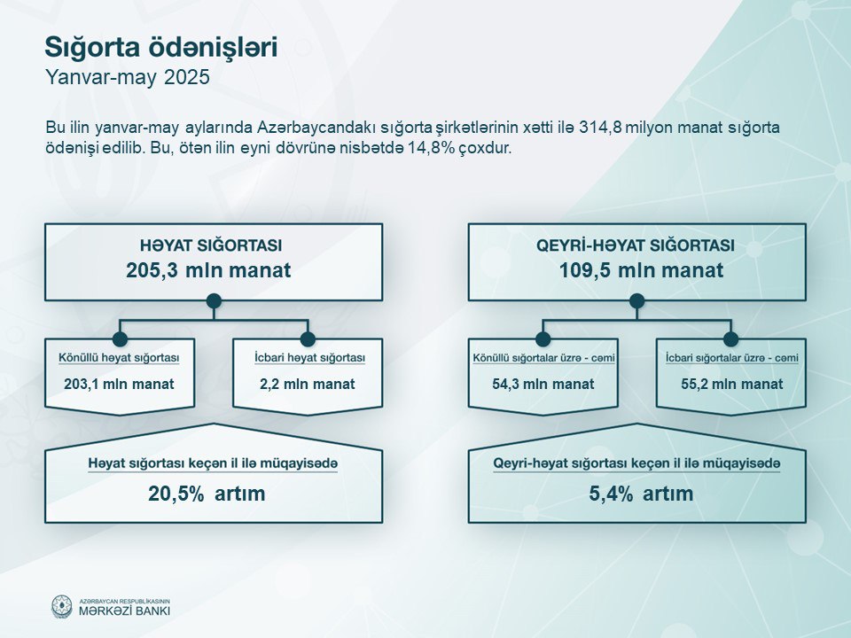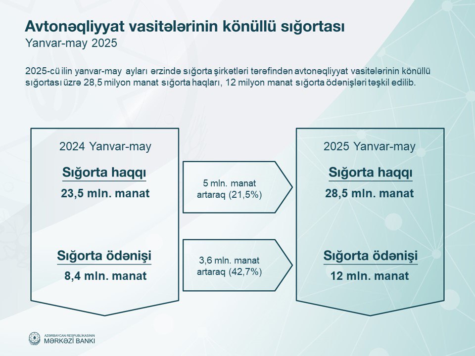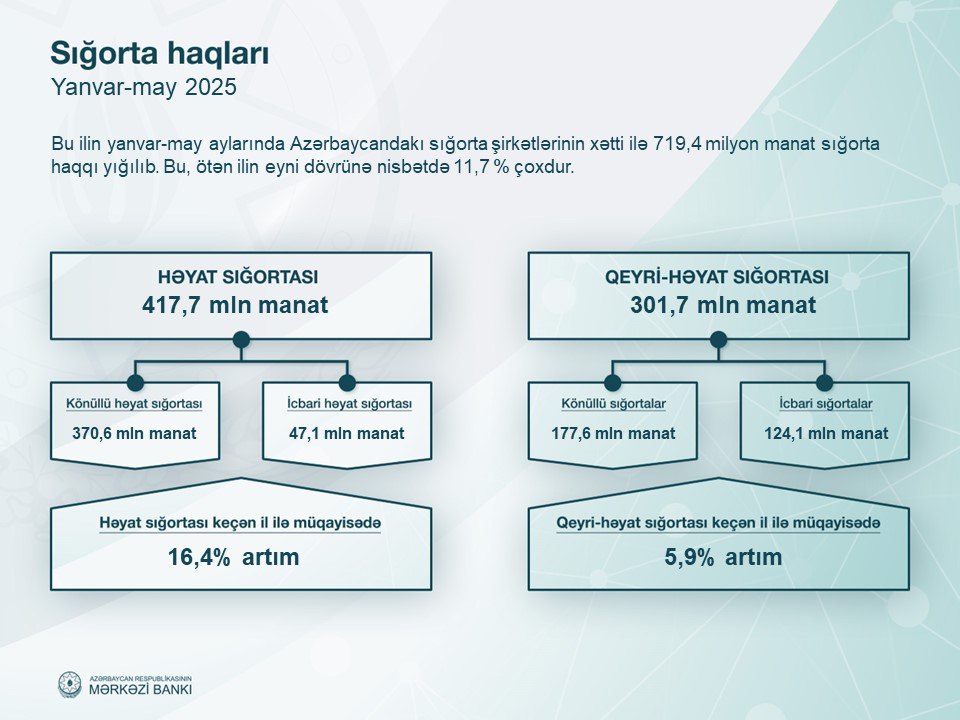 2025-ci ilin yanvr-may aylarında (ilk 5 ay) Azərbaycanın sığorta şirkətlərinin xəttilə 719,4 milyon manat sığorta haqqı yığılıb. Bu, ötən ilin eyni dövrü ilə müqayisədə 11,7% çoxdur.