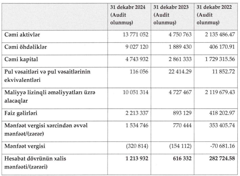 Qeyd edək ki, "Legion Financial" ASC 2023-cü ili 616 min manat, 2024-cü ili isə 1 milyon 214 min manat xalis mənfəət ilə bağlayıb.