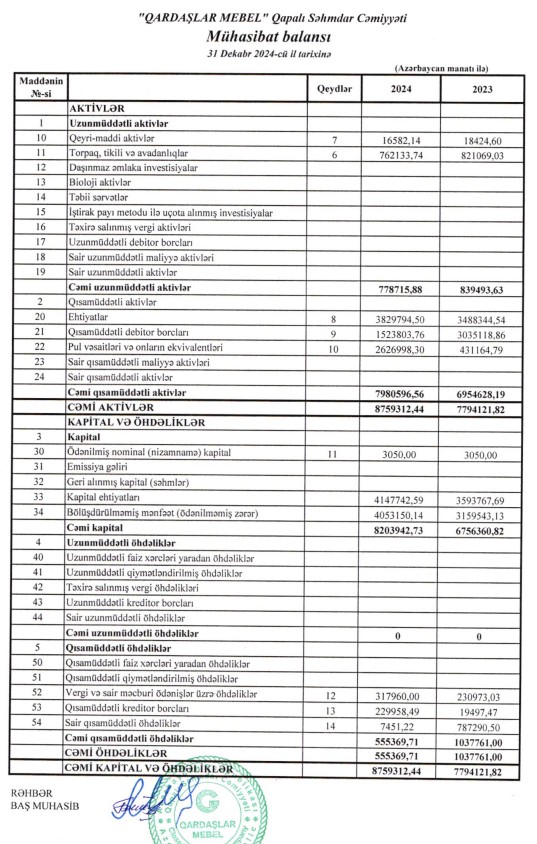 31 dekabr 2024-cü il tarixində "Qardaşlar Mebel" QSC 8 milyon 759 min manat cəmi aktivlərə malik olub. Şirkət 2023-cü ilin sonunda 7 milyon 791 min manat cəmi aktivlərə malik idi.