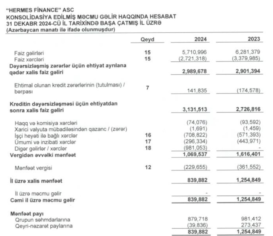 Marja.az xəbər verir ki, "Hermes Finance"ın faiz gəlirləri 2023-cü ildə 6 milyon 281 min manat ikən, 2024-cü ildə 5 milyon 711 min manat təşkil edib (571 min manat və ya 9,1% azalıb).