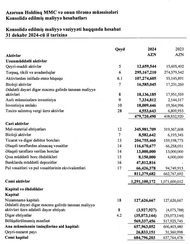 31 dekabr 2024-cü il tarixində "Azərsun Holdinq" MMC 1 milyard 291 milyon 100 min manat cəmi aktivlərə malik olub. Şirkət 2023-cü ilin sonunda 1 milyard 71 milyon 601 min manat cəmi aktivlərə malik idi.
