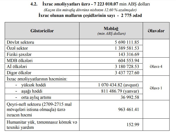 Fiziki şəxslərin ixracı 139 milyon 699 min dollardan 143 milyon 316 min dollara, dövlət sektorunun ixracı isə 4 milyard 585 milyon dollardan 5 milyard 690 milyon dollara qalxıb. Ötən ilin yanvar-avqust dövrü ilə müqayisədə bu ilin eyni dövründə dövlət sektrorunun ixracı 1 milyard 105 milyon dollar və ya 24,1% artıb.