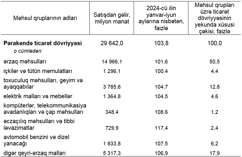 2024-cü ilin yanvar-iyun ayları ilə müqayisədə pərakəndə ticarət dövriyyəsi real ifadədə 3,8 faiz, o cümlədən ərzaq məhsulları, içkilər və tütün məmulatları üzrə 1,5 faiz, qeyri-ərzaq malları üzrə 6,7 faiz artmışdır.