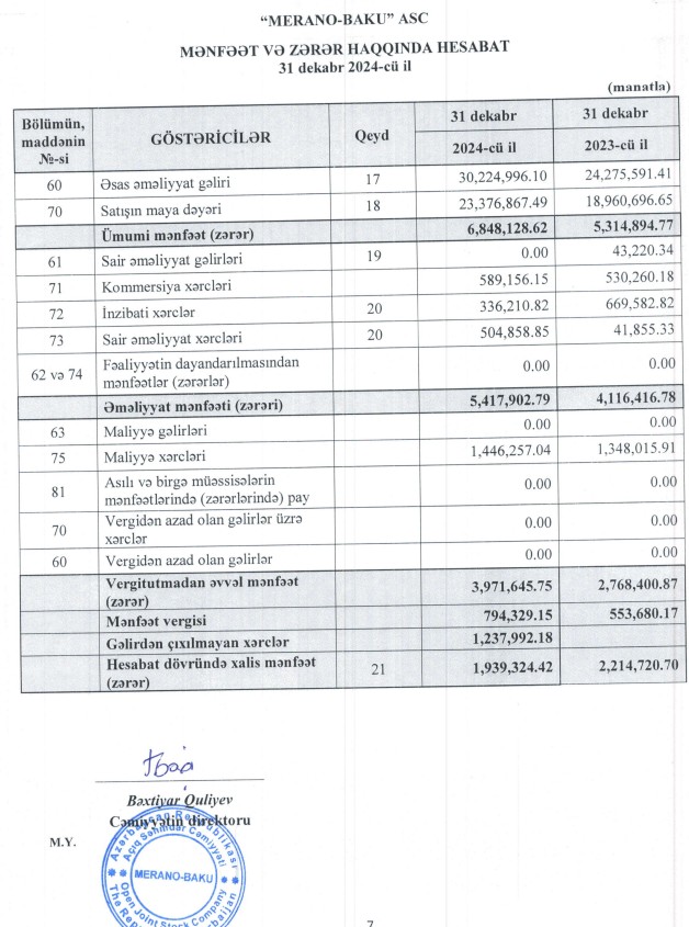 Qida məhsullarının topdan satışı fəaliyyətilə məşğul olan "Merano-Baku" ASC 2024-cü ili 1 milyon 939 min manat xalis mənfəət ilə başa vurub. Şirkət 2023-cü ili 2 milyon 215 min manat xalis mənfəət ilə bağlamışdı. Beləliklə, "Merano-Baku" şirkətinin xalis mənfəəti 2024-cü ildə 276 min manat və ya 12,5% azalıb.