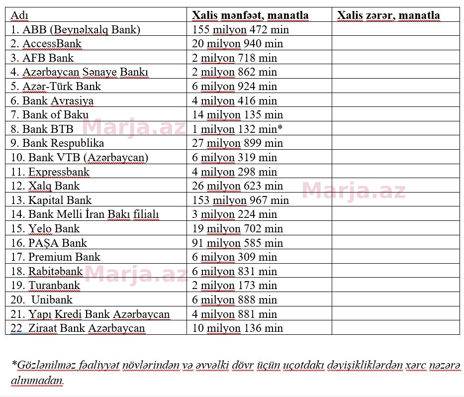 Bankların adları və xalis mənfəət məbləğləri ilə aşağıdakı cədvəldən tanış ola bilərsiniz.