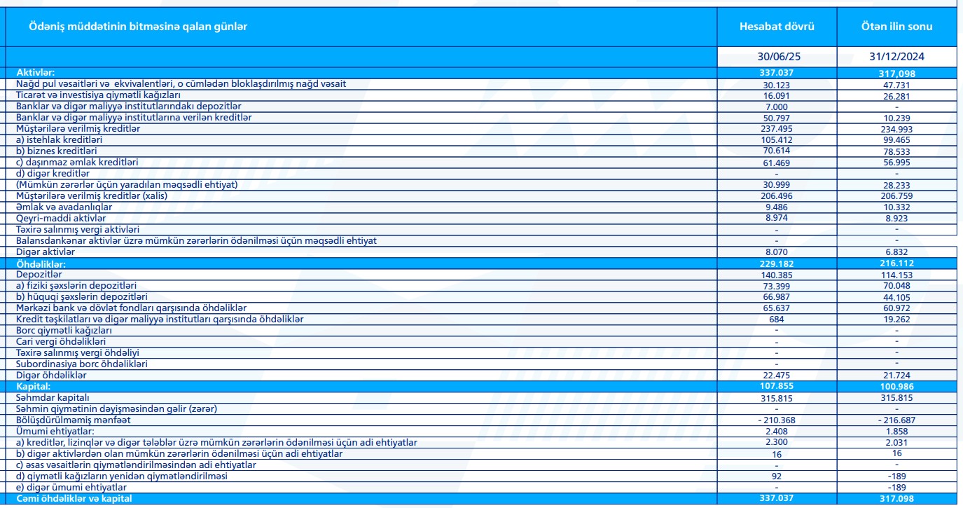 Bankın cəmi aktivləri 2024-cü ilin sonu ilə müqaisədə 10 faiz artaraq 337 milyon 37 min manata çatıb.