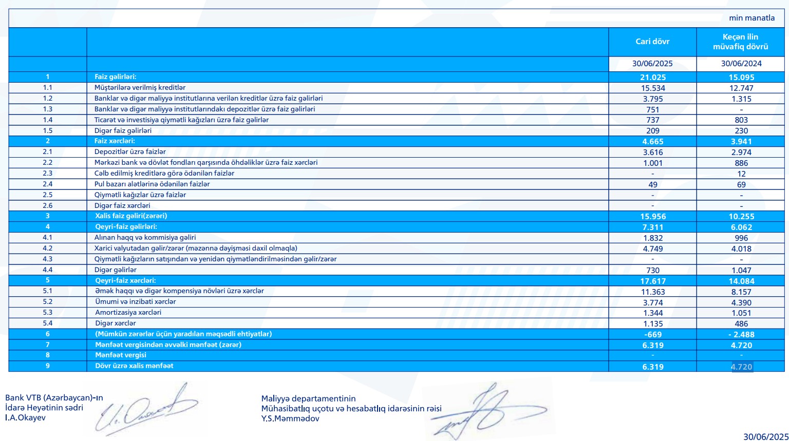 2025-ci ilin ilk 6 ayı ərzində VTB (Azərbaycan)-ın xalis faiz gəlirləri 15,9 milyon manat, qeyri-faiz gəlirləri isə 7 milyon 300 min manat təşkil edib.