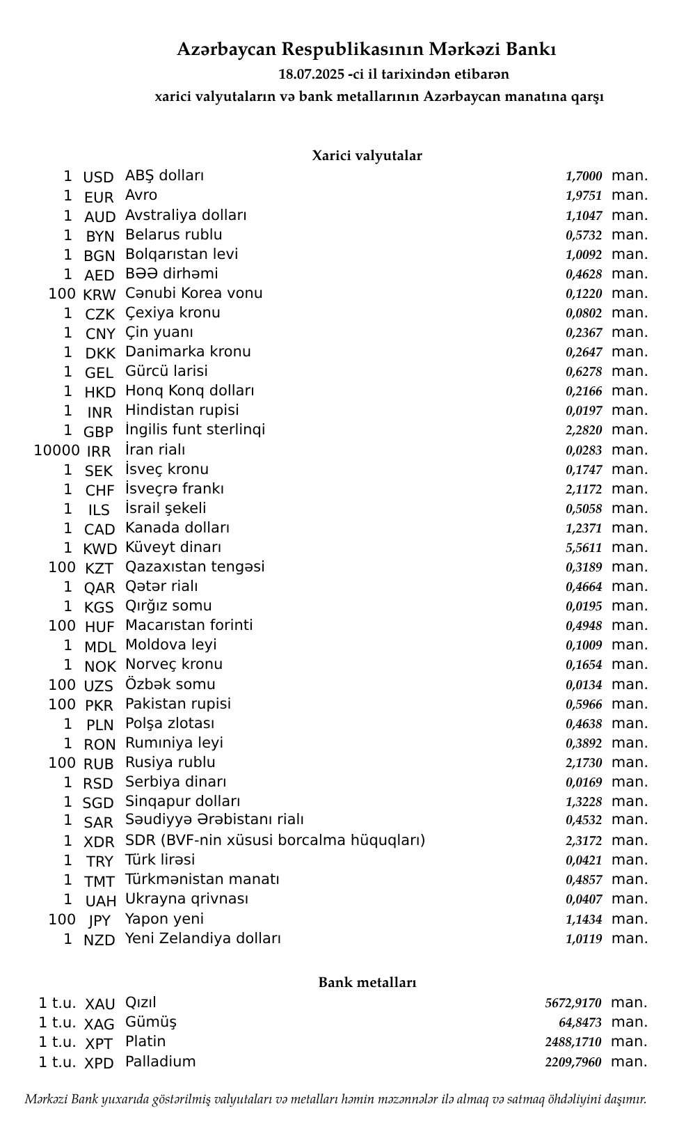 Rəsmi məzənnələr açıqlandı