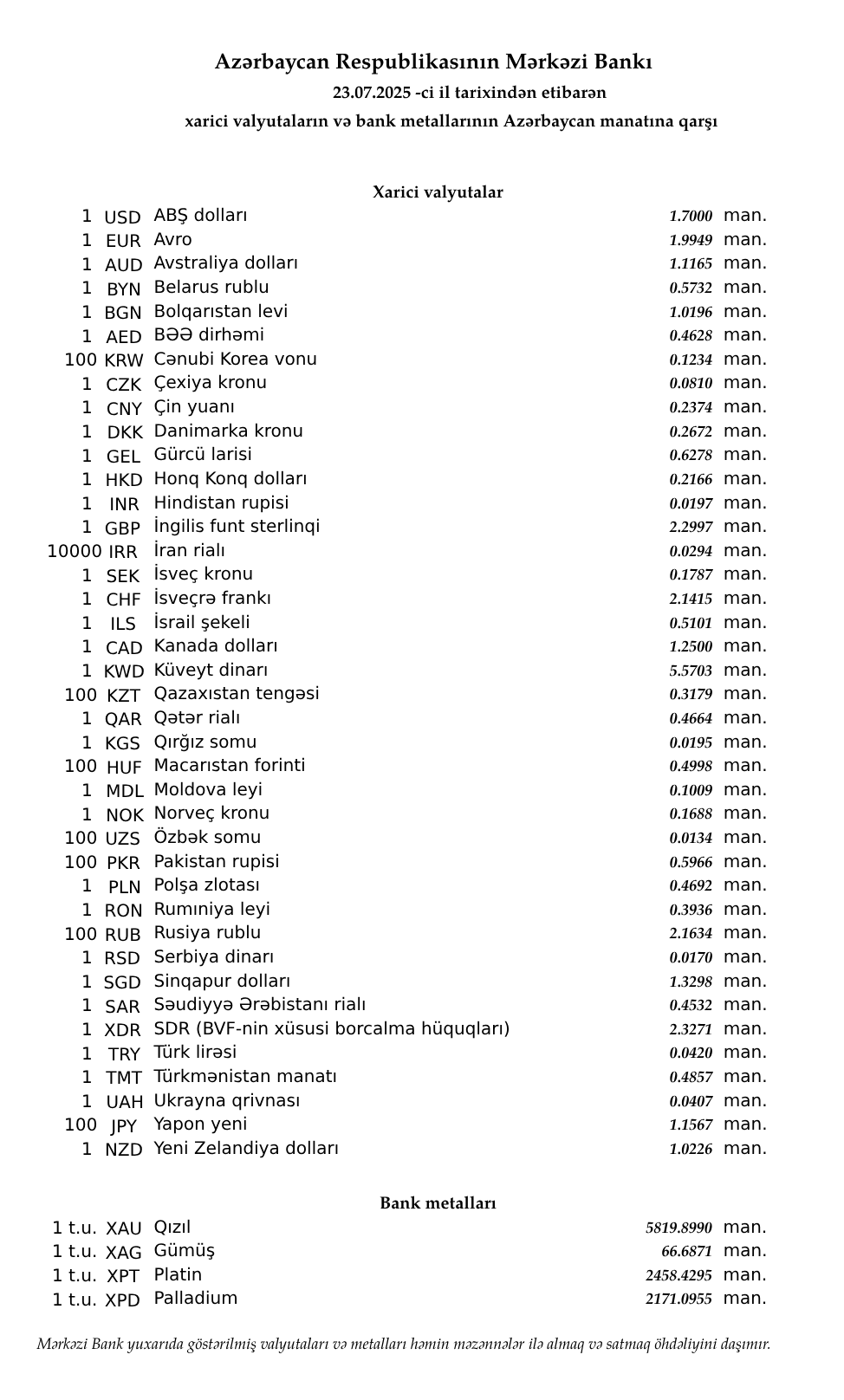Rəsmi məzənnələr açıqlandı