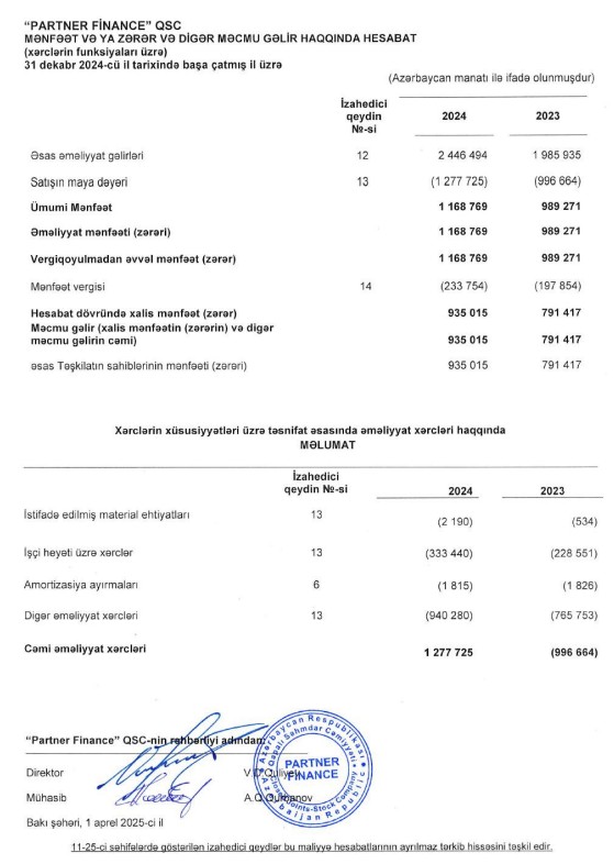 Marja.az maliyyə hesabatına istinadən xəbər verir ki, keçən il "Partner Finance"ın əsas əməliyyat gəlirləri 460 min manat və ya 23,2% artaraq 2 milyon 446 min manat təşkil edib. 2023-cü ildə Şirkətin əsas əməliyyat gəlirləri 1 milyon 986 min manat təşkil etmişdi.