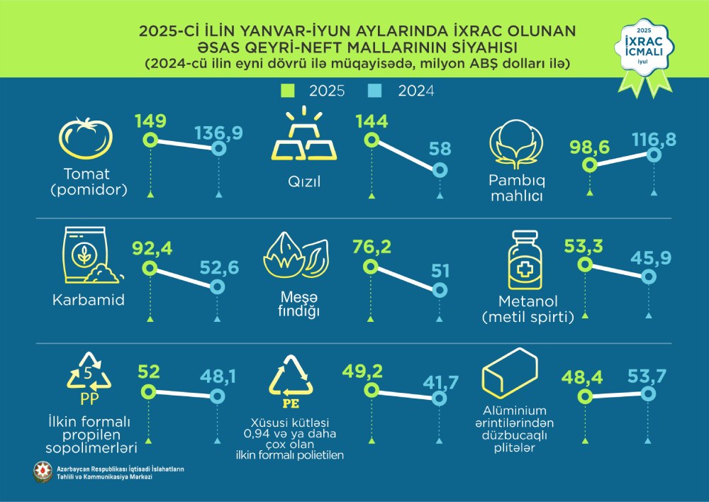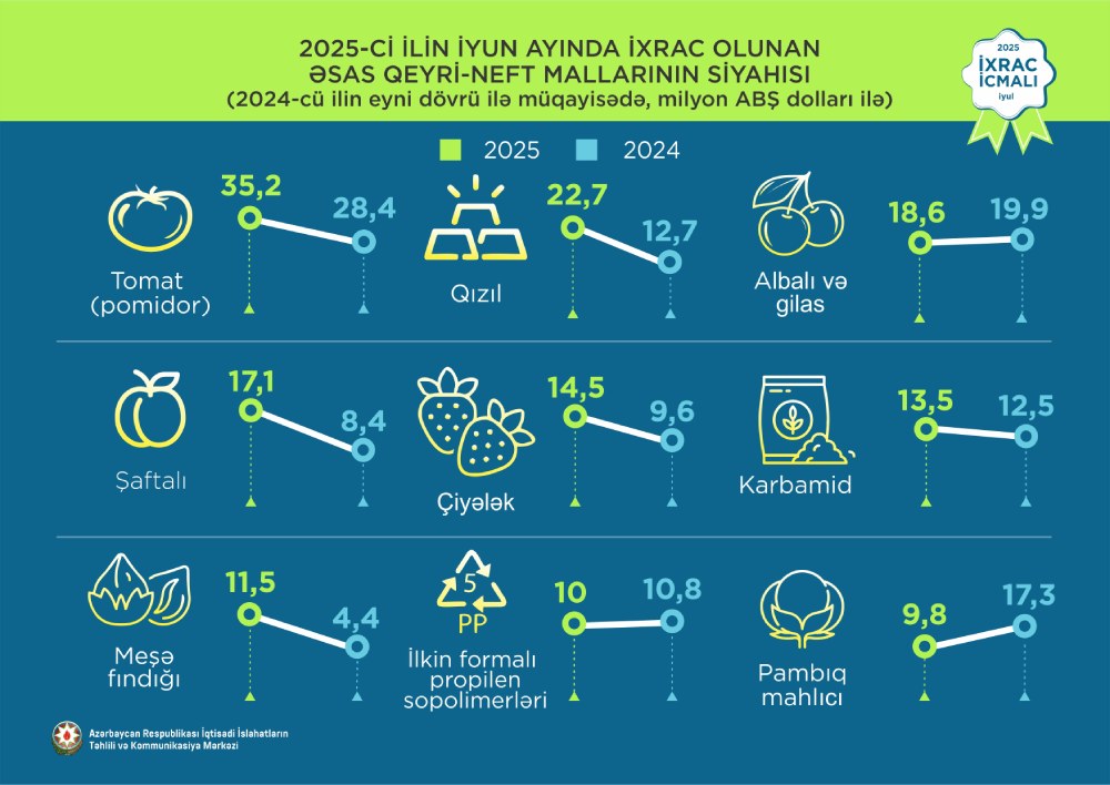 2025-ci ilin iyun ayı ərzində ixrac edilmiş qeyri-neft sektoruna aid malların siyahısında pomidor (tomat) (35.2 milyon ABŞ dolları) birinci olub. Bu siyahıda qızıl (22.7 milyon ABŞ dolları) ikinci, təzə albalı və gilas (18,8 milyon ABŞ dolları) isə üçüncü yerdə qərarlaşıb.