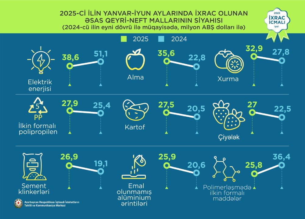 İcmala əsasən, 2025-ci ilin yanvar-iyun aylarında Azərbaycanın qeyri-neft sektoru üzrə ixracı 2024-cü ilin müvafiq dövrü ilə müqayisədə 9.9% artaraq 1,8 milyard ABŞ dolları təşkil edib. Bu dövrdə yeyinti məhsulları üzrə ixrac 19,1% artaraq 564.7 milyon ABŞ dollarına bərabər olub.