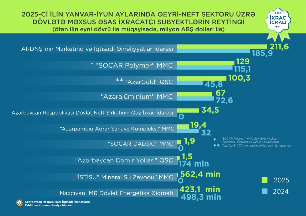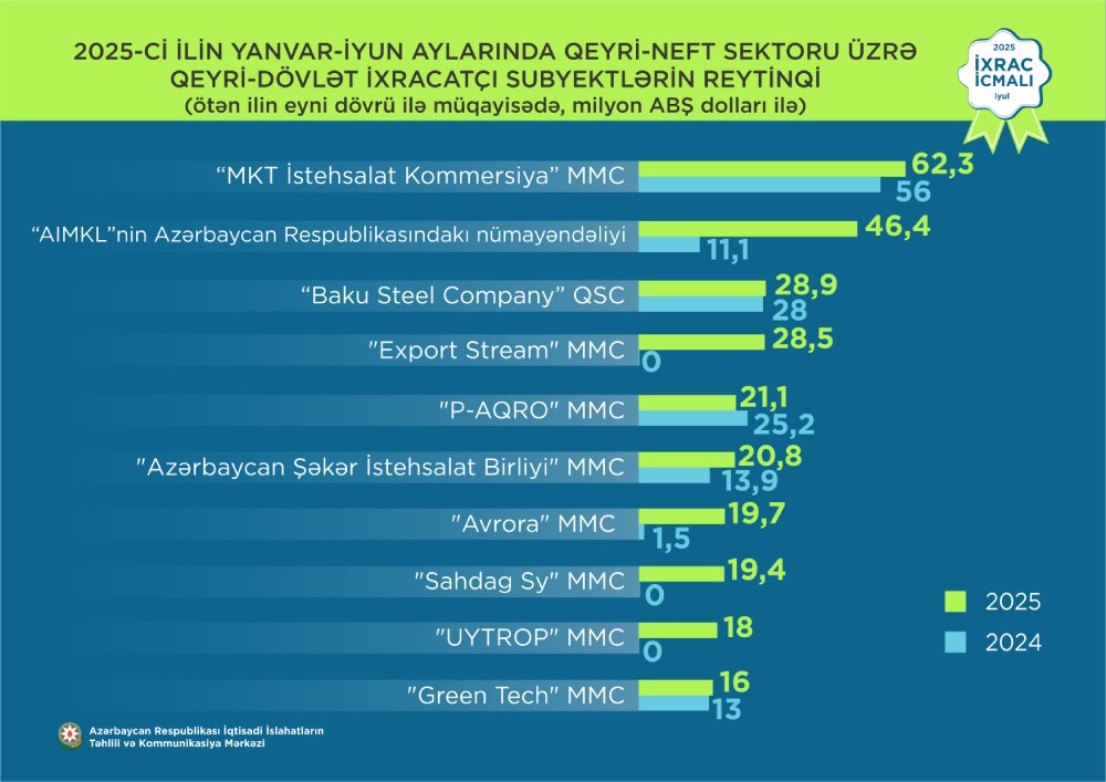 Marja xəbər verir ki, 2025-ci ilin yanvar-iyun ayları üzrə hazırlanmış qeyri-dövlət ixracatçı subyektlərin reytinqində ilk onluqda aşağıdakı şirkətlər təmsil olunublar: