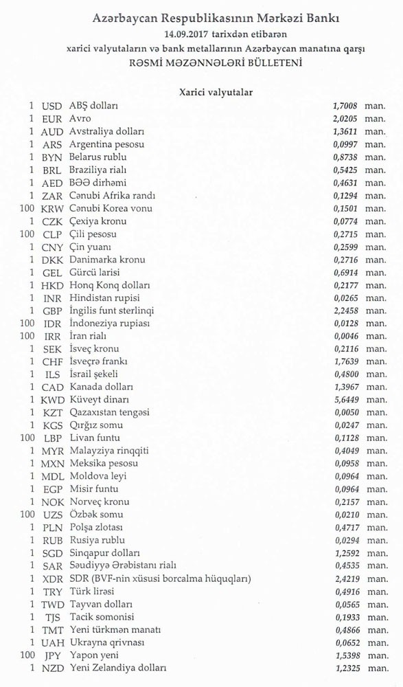 Sentyabrın 13-də rəsmi olaraq 1 dollar 1,7008 manata, 1 avro isə 2.0382 manata bərabər idi.