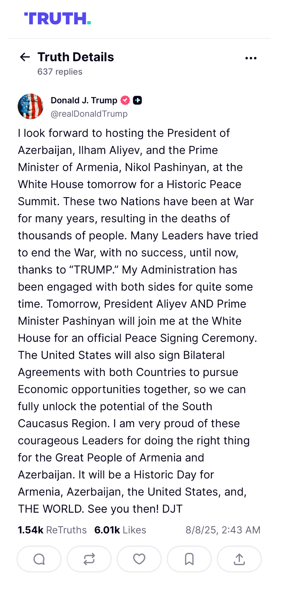 "I look forward to hosting the President of Azerbaijan, Ilham Aliyev, and the Prime Minister of Armenia, Nikol Pashinyan, at the White House tomorrow for a Historic Peace Summit. These two Nations have been at War for many years, resulting in the deaths of thousands of people. Many Leaders have tried to end the War, with no success, until now, thanks to “TRUMP.” My Administration has been engaged with both sides for quite some time. Tomorrow, President Aliyev AND Prime Minister Pashinyan will join me at the White House for an official Peace Signing Ceremony. The United States will also sign Bilateral Agreements with both Countries to pursue Economic opportunities together, so we can fully unlock the potential of the South Caucasus Region. I am very proud of these courageous Leaders for doing the right thing for the Great People of Armenia and Azerbaijan. It will be a Historic Day for Armenia, Azerbaijan, the United States, and, THE WORLD. See you then! DJT"