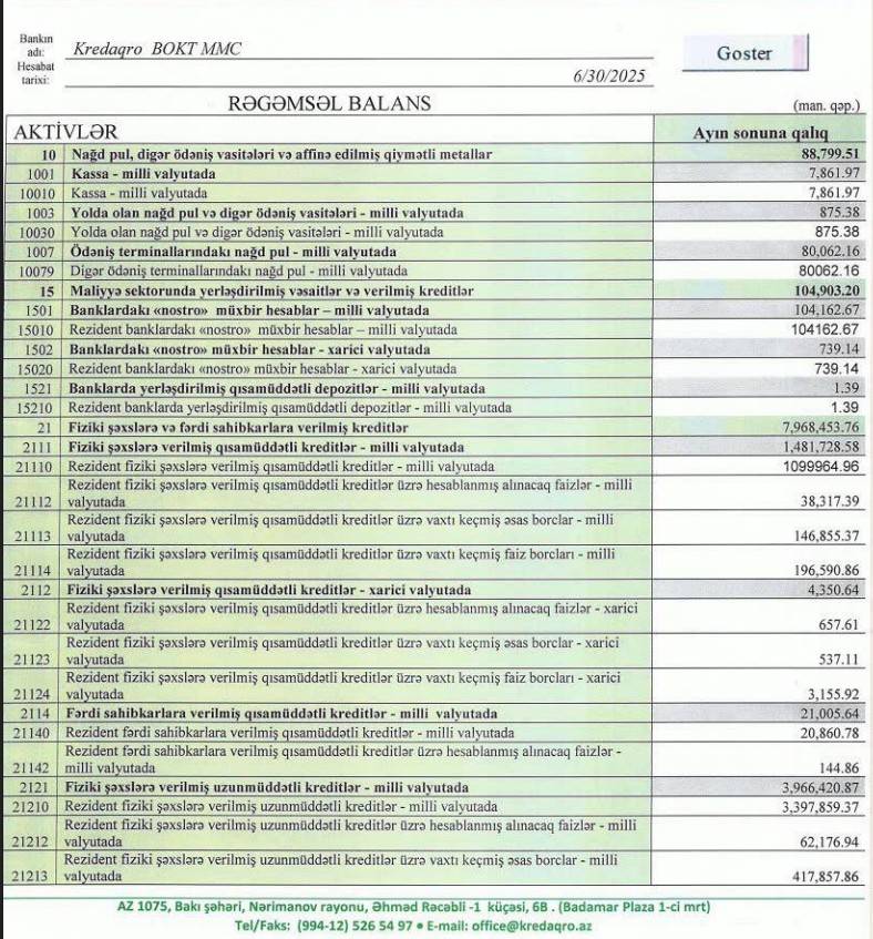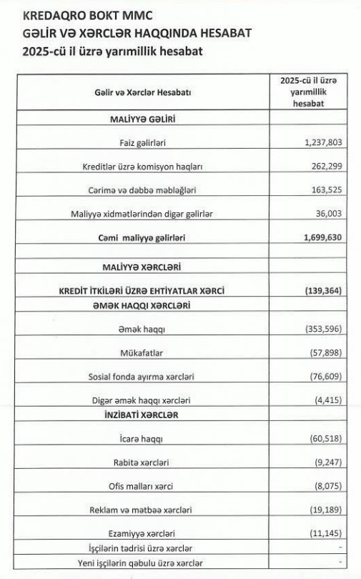 "BOKT KredAqro" MMC 2025-ci ilin ilk 6 ayını (yanvar-iyun) 207 min manat xalis mənfəət ilə başa vurub.