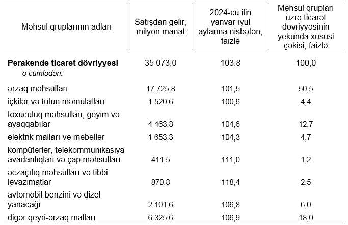 2025-ci ilin yanvar-iyul aylarında pərakəndə ticarət şəbəkəsində istehlakçılara 35,1 milyard manatlıq, o cümlədən 19,3 milyard manatlıq ərzaq məhsulları, içkilər və tütün məmulatları, 15,8 milyard manatlıq qeyri-ərzaq malları satılmışdır.