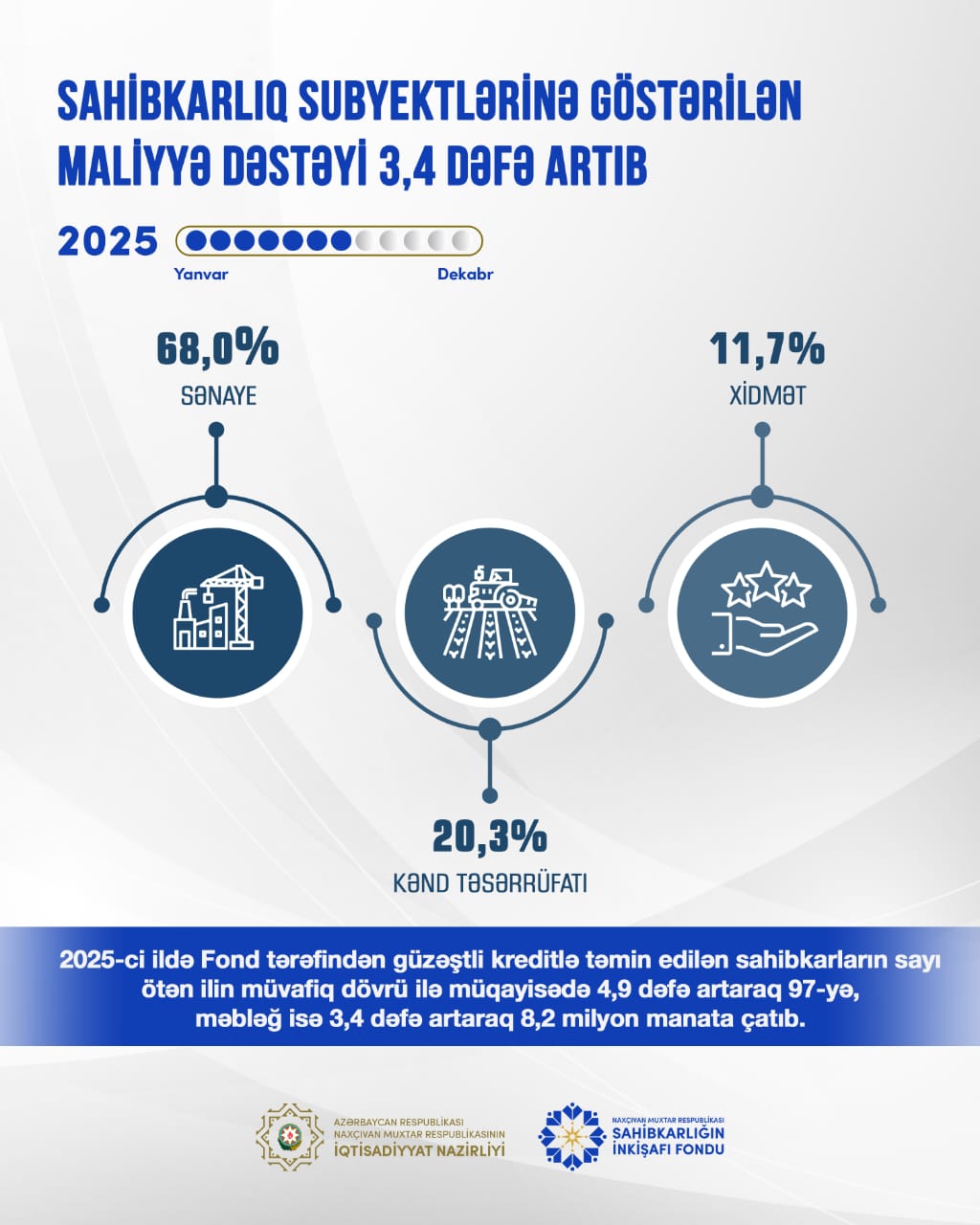 2025-ci ilin yanvar-iyul ayları ərzində Naxçıvan Muxtar Respublikasının Sahibkarlığın İnkişafı Fondu tərəfindən güzəştli kreditlə təmin edilən sahibkarlıq subyektlərinin sayı 2024-cü ilin eyni dövrü ilə müqayisədə 4,9 dəfə artaraq 97-yə çatıb.