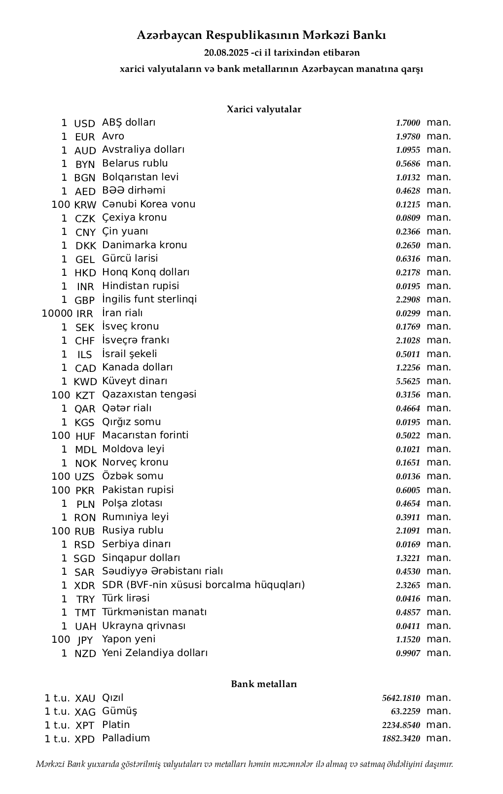 Rəsmi məzənnələr açıqlandı