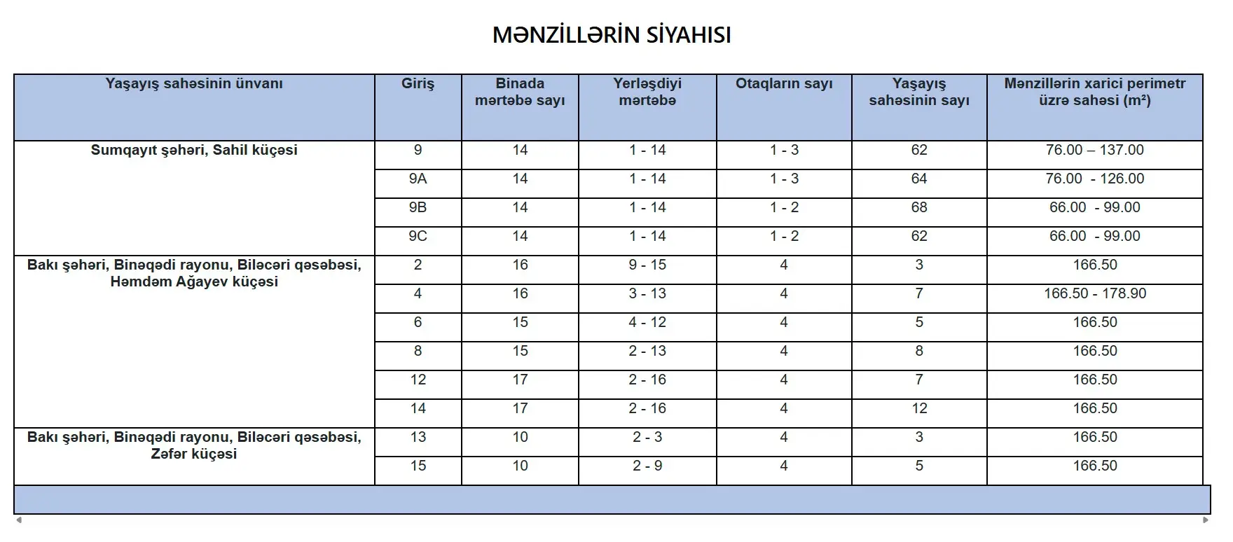 Marja.az fonda istinadən xəbər verir ki, yeni mənzillər seçim üçün 27.08.2025-ci il tarixində saat 15:00-dan etibarən açıq olacaq. Vətəndaşlar təqdim olunan yaşayış sahələrinin siyahısı ilə bu keçid vasitəsilə tanış ola bilərlər.