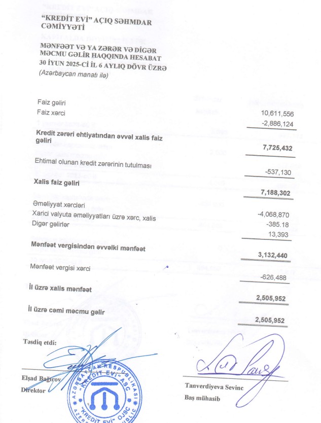 "Kredit Evi" ASC 2025-ci ilin ilk 6 ayını (yanvar-iyun) 2 milyon 506 min mant xalis mənfəət ilə başa vurub. Yeri düşmüşkən qeyd edək ki, "Kredit Evi" ASC 2023-cü ili 1 milyon 518 min manat, 2024-cü ili 2 milyon 892 min manat xalis mənfəət ilə bağlamışdı.