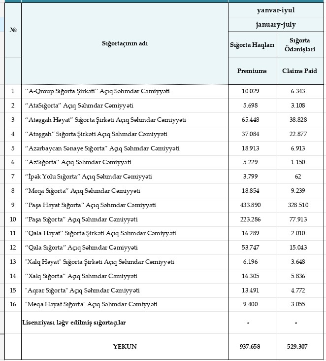 Xəbər verdiyimiz kimi, 2025-ci ilin yanvar-iyul aylarında (7 ayda) Azərbaycandakı sığorta şirkətlərinin xəttilə 937,7 milyon manat sığorta haqları hesablanıb ki, bu da ötən ilin eyni dövrü ilə müqayisədə 12,5% çoxdur. 2025-ci ilin yanvar-iyul aylarında (7 ayda) Azərbaycandakı sığorta şirkətlərinin xəttilə 529,3 milyon manat sığorta ödənişi həyata keçirilib ki, bu da ötən ilin eyni dövrü ilə müqayisədə 20,7% çoxdur.