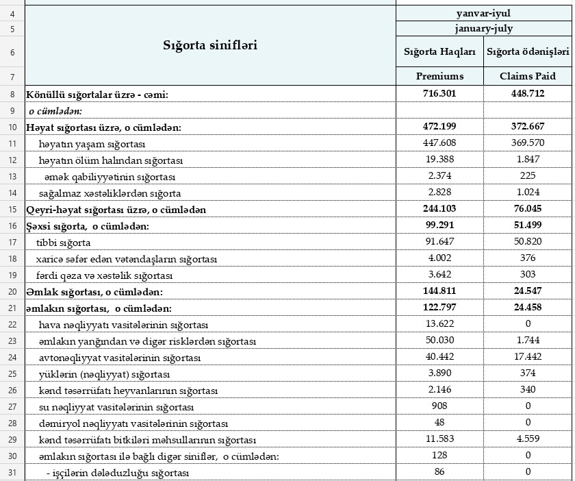 Bu ilin yanvar-iyul aylarında Azərbaycanda könüllü sığorta növləri hesabına 716 milyon 301 milyon manat sığorta haqqı toplanılıb. Bu, 2024-cü ilin eyni dövrü ilə müqayisədə 14,8 % çoxdur.