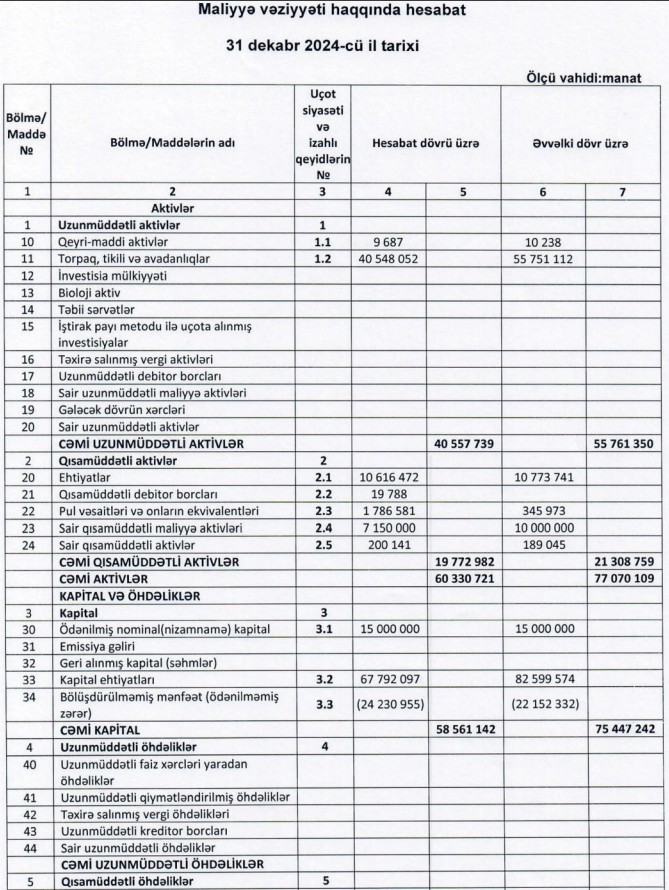31 dekabr 2024-cü il tarixində "Azərxalça” ASC-də yığılmış zərər 24 milyon 231 min manata çatıb (2023-cü ilin sonunda 22 milyon 152 min manat). Şirkətdə yığılmış zərər dövlətə məxsus 15 milyon manatlıq nizamnamə kapitalıbdan çoxdur.