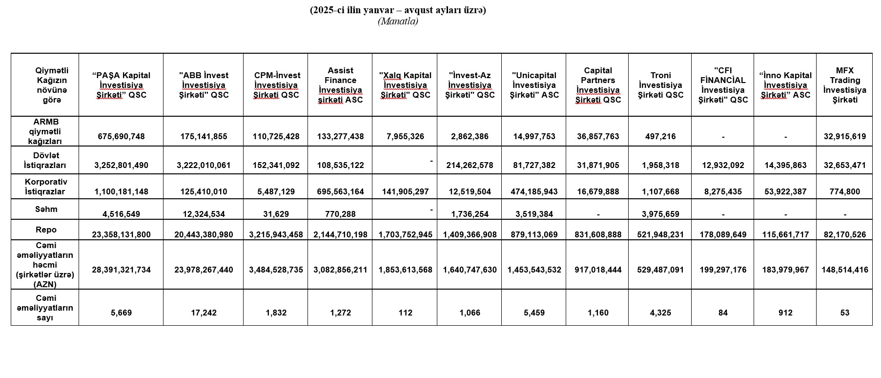 Marja.az Birjaya istinadən xəbər verir ki, 23 milyard 978 milyon 267 min manat əməliyyat həcmilə “PAŞA Kapital İnvestisiya Şirkəti” QSC 1-ci, 20 milyard 443 milyon 381 min manat əməliyyat həcmilə "ABB İnvest İnvestisiya Şirkəti" QSC 2-ci, 3 milyard 215 milyon 943 min manat əməliyyat həcmilə "CPM-İnvest İnvestisiya Şirkəti" QSC 3-cü yeri tutub.
