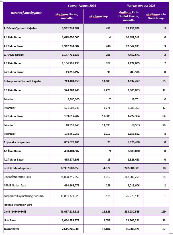 2025-ci ilin yanvar – avqust ayları ərzində ticarət dövriyyəsinin 37 milyard 357 milyon 982 min manatı və ya 85,6%-i REPO əməliyyatlarının payına düşüb. REPO əməliyyatları üzrə ticarətin həcmi 20 milyard 209 milyon 738 min manat vıə ya 86,3% artıb.