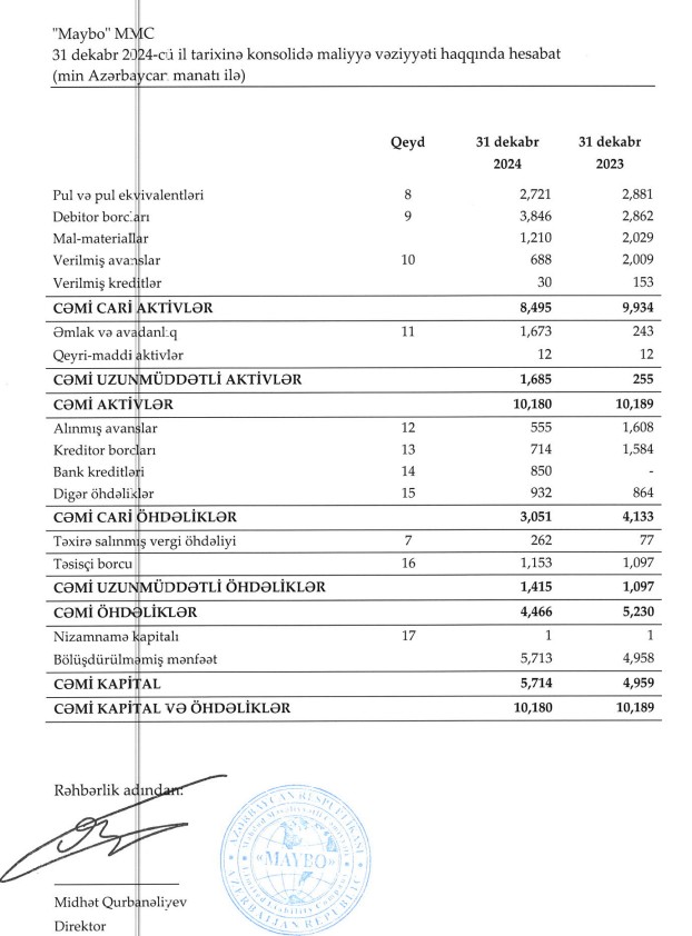 Marja.az "Maybo" МMС-nin 31 dekabr 2024-cü il tarixində bitən il üzrə konsolidasiya edilmiş maliyyə hesabatlarına istinadən xəbər verir ki, Şirkətin satışdan gəlirləri 2023-cü ildə 10 milyon 596 min manat ikən, 2024-cü ildə 13 milyon 342 min manat təşkil edib (2 milyon 746 min manat və ya 26% artıb).