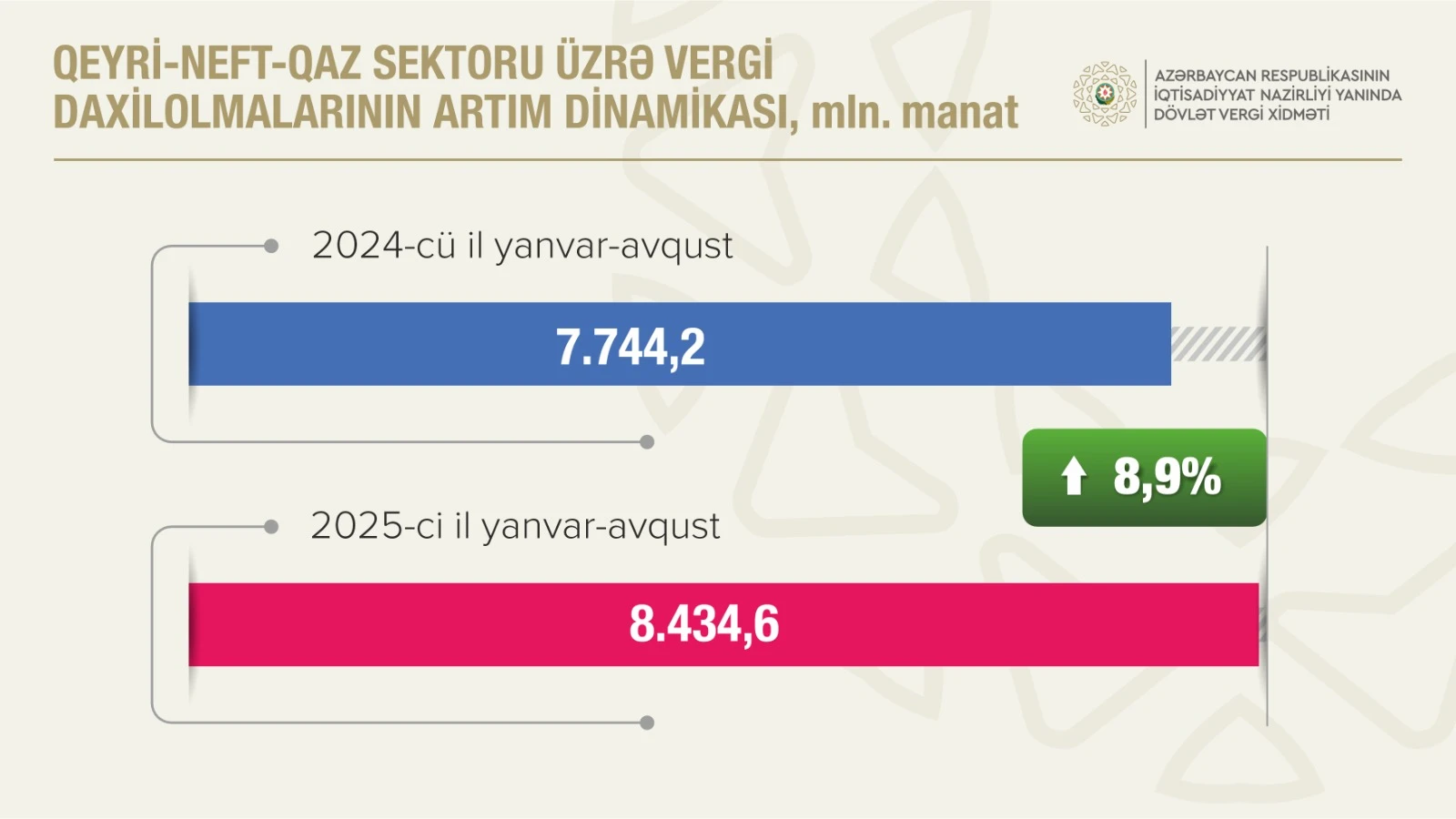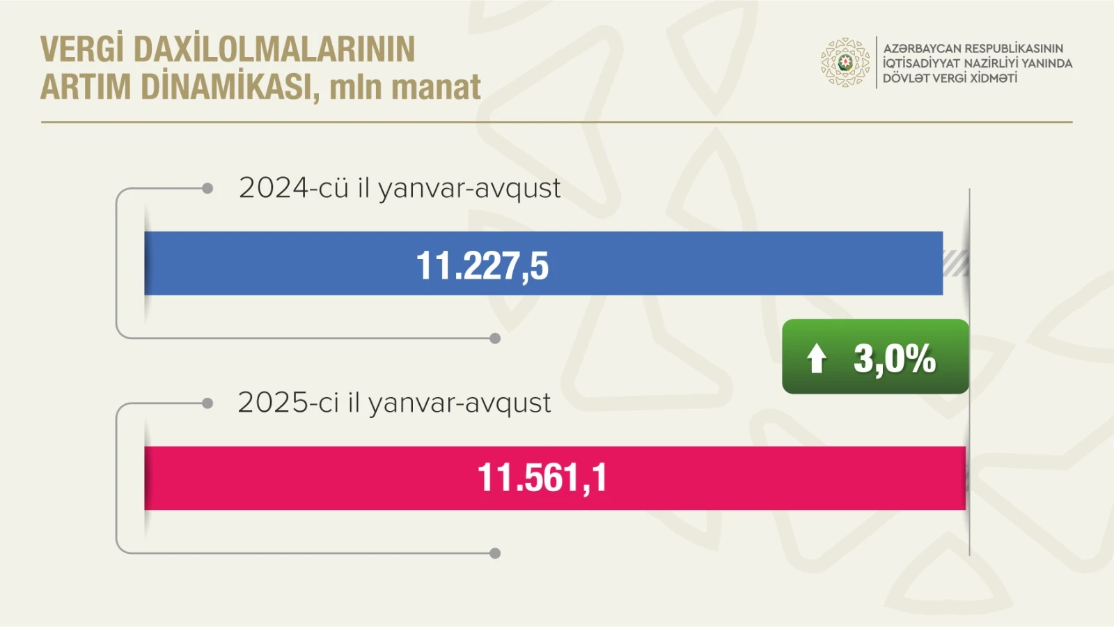 Vergilərin 73 faizi qeyri-neft-qaz sektorunun payına düşüb2025-ci ilin yanvar-avqust aylarında İqtisadiyyat Nazirliyi yanında Dövlət Vergi Xidmətinin xəttilə dövlət büdcəsinə 11 milyard 561,1 milyon manat vergi daxil olub, proqnoza 105,4 faiz əməl edilib. 2024-cü ilin müvafiq dövrü ilə müqayisədə dövlət büdcəsinə vergi daxilolmaları 333,6 milyon manat və ya 3,0 faiz artıb.