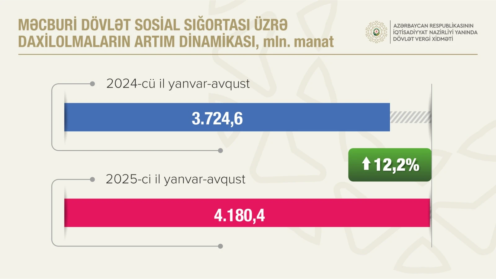 Bundan başqa, 2025-ci ilin yanvar-avqust aylarında muzdlu işçi sayının və əməkhaqqı fondunun “ağarması” prosesi şəraitində məcburi dövlət sosial sığorta haqları üzrə daxilolmalar 4 milyard 180,4 milyon manat olub. Bu mənbədən daxilolmalar əvvəlki ilin müvafiq dövrü ilə müqayisədə 12,2 faiz və ya 455,8 milyon manat artıb. Qeyri-büdcə təşkilatları üzrə daxilolmalar ötən ilin eyni dövrü ilə müqayisədə 13,2 faiz artaraq 2 milyard 788,5 milyon manat təşkil edib.