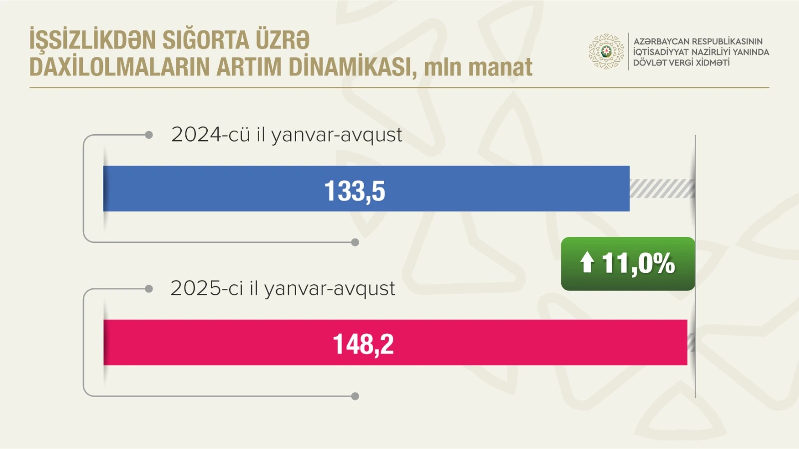 İşsizlikdən sığorta haqları üzrə daxilolmalar 2024-cü ilin eyni dövrü ilə müqayisədə 11,0 faiz artaraq 148,2 milyon manat olub. Qeyri-büdcə təşkilatları üzrə daxilolmalar 12,3 faiz artaraq 113,2 milyon manat təşkil edib.